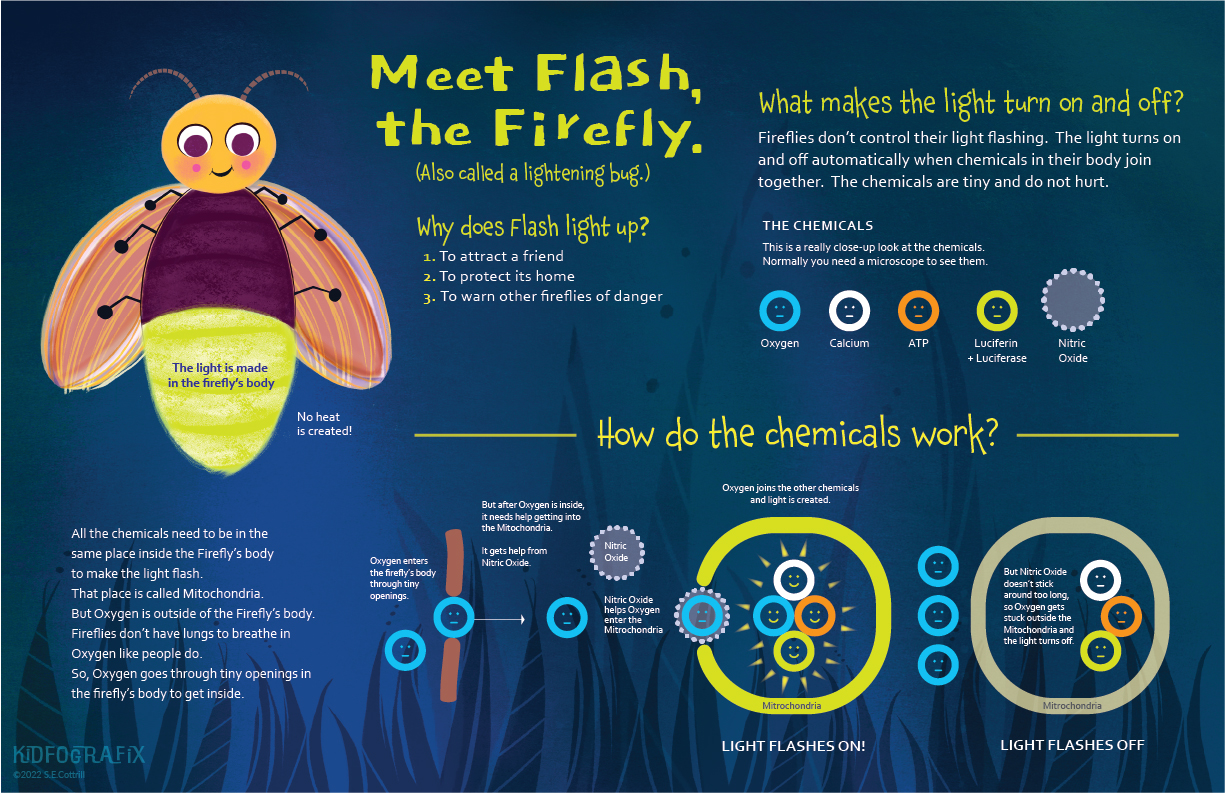 I’m querying and working on a series of “KidfoGraphix” (infographics for kids) for my portfolio. These are based on topics that I’ve been curious about (and think kids might be curious about too.) For example: What makes a Firefly’s light blink.